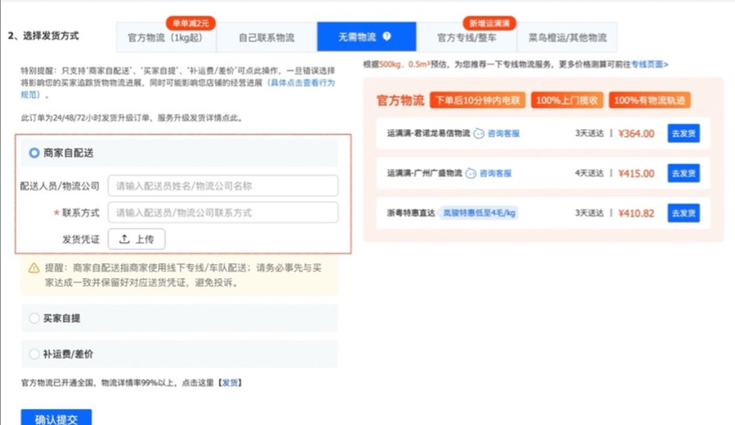 注意:为充分规范“无需物流”的使用(仅在经双方沟通一致且买家自提、商家使用线下专线/车队等无线上运踪能力的配送方式的情况下方可使用‘无需物流’发货)。