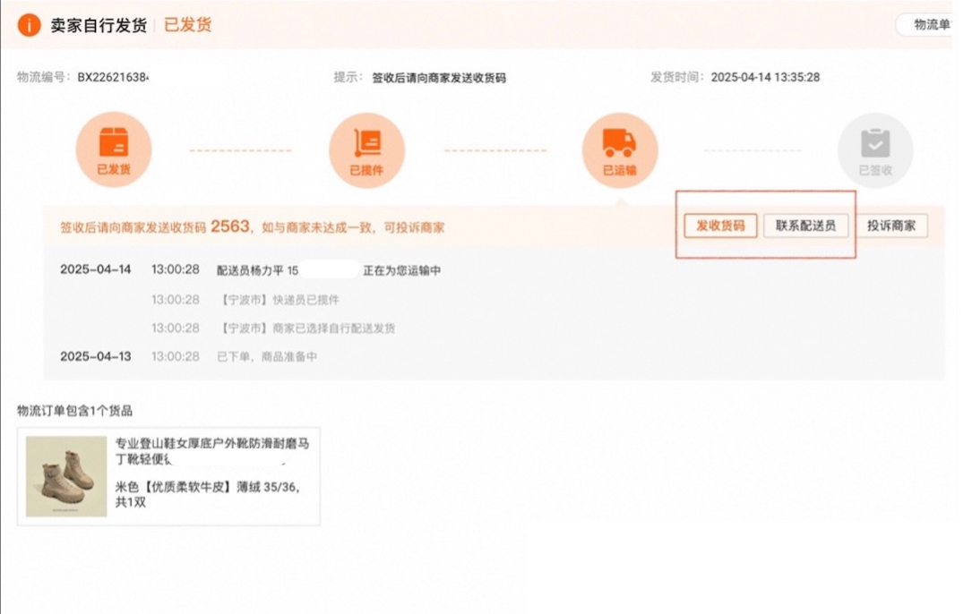 2.新增收货码用于推进签收状态。“该主单下所有商品均已发货” 且发货2小时后,商家可向买家获取该订单的收货码用于核销,核销成功后该运单的货物状态推进为“已签收”。买家收货码查询路径:1688商家工作台-已买到的货品-订单详情-物流信息。