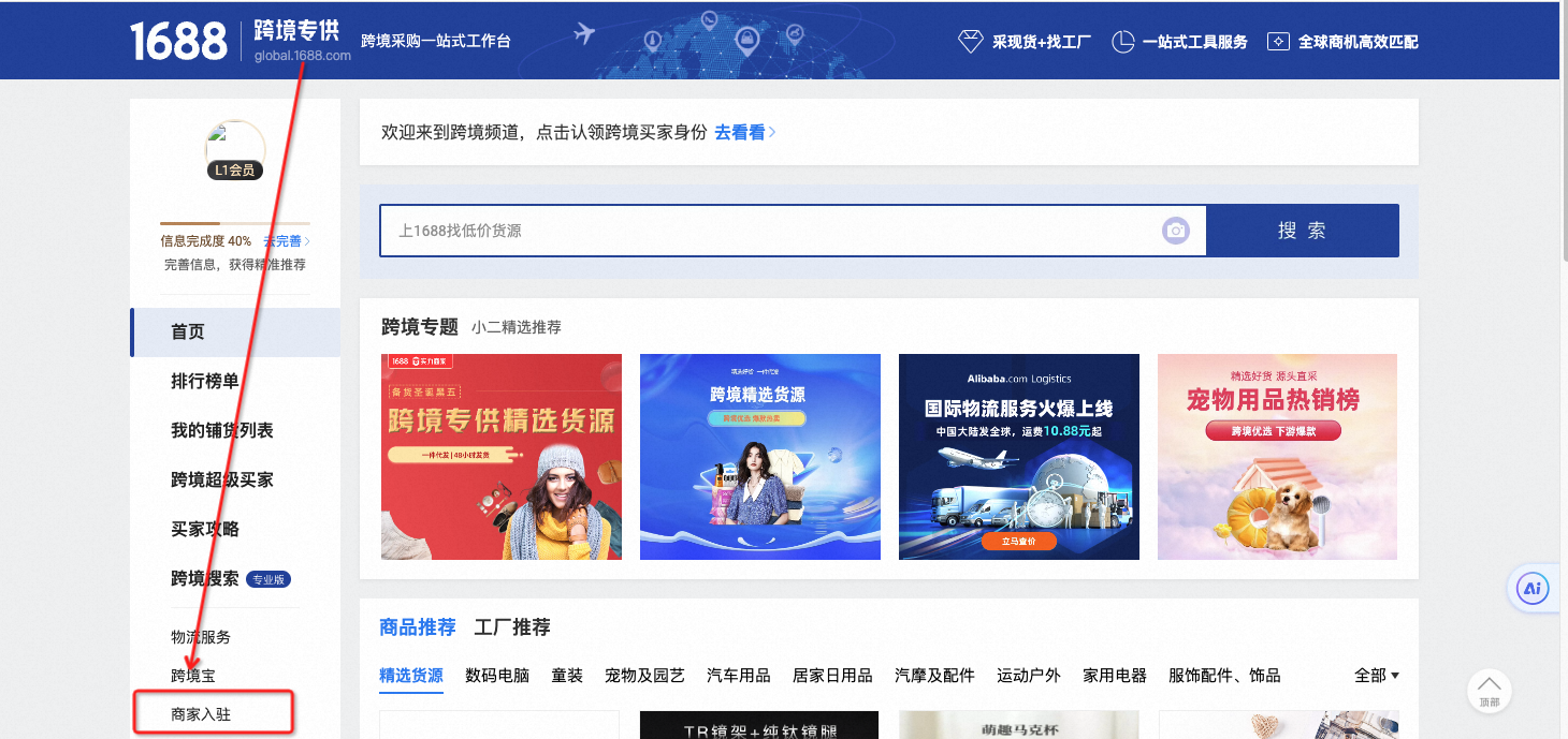 第一步:进入1688跨境平台(global.1688.com )首页